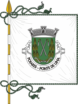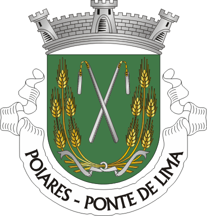 Armas - Escudo de verde, dois manguais de prata realçados de negro e ligados de ouro, passados em aspa, entre dois ramos de espigas de centeio de ouro, com os pés passados em aspa e atados de prata. Coroa mural de prata de três torres. Listel branco com a legenda a negro: “ POIARES – PONTE DE LIMA “.